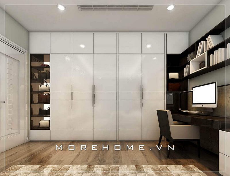 Mẫu tủ quần áo gỗ công nghiệp màu trắng kết hợp kệ trang trí ấn tượng cho không gian phòng ngủ