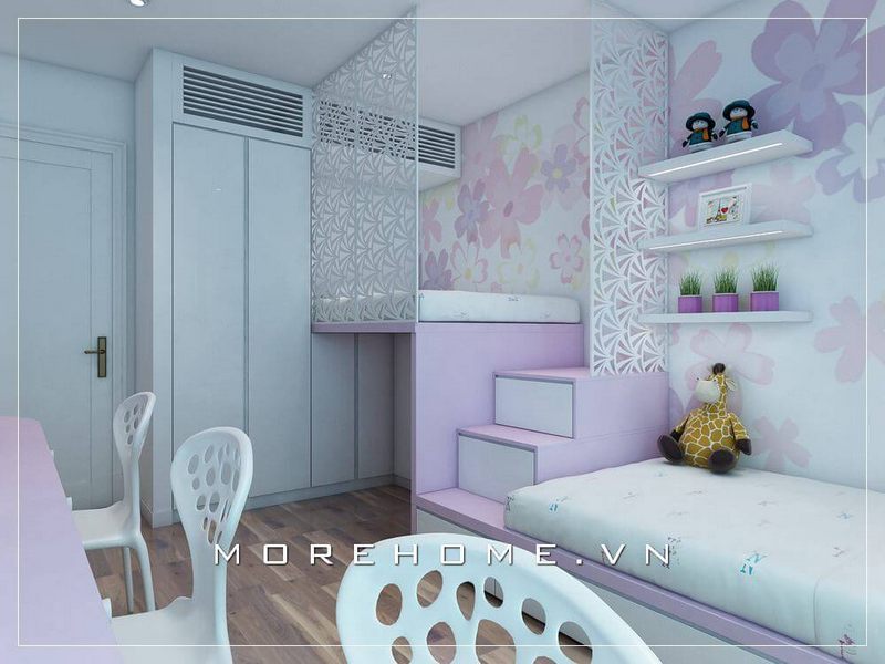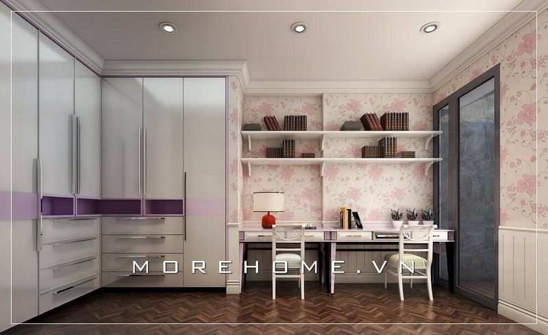 Tủ quần áo gỗ công nghiệp âm tường, tone màu trắng nhã nhặn kết hợp màu hồng nhẹ nhàng mang đến không gian phòng ngủ con thêm đẹp mắt, dễ thương hơn