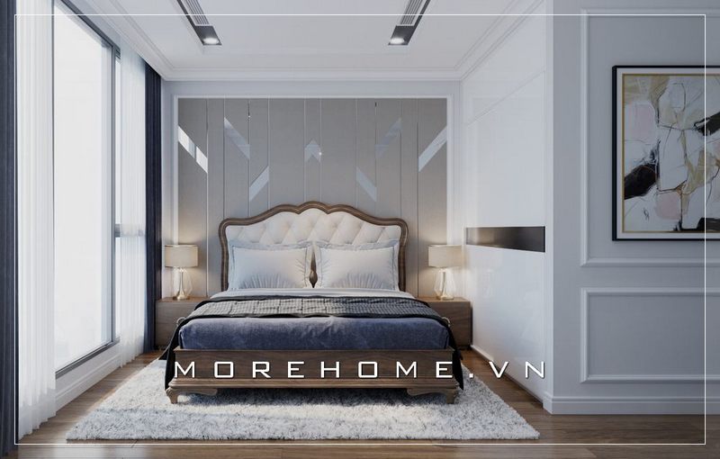 . Không gian nghỉ ngơi của gia chủ được trang trí bằng nội thất phòng ngủ Master phong cách tân cổ điển sang trọng và ấn tượng, bao gồm các món đồ gỗ tự nhiên màu trắng, sàn gỗ màu nâu trầm mang đến cảm giác ấm áp.